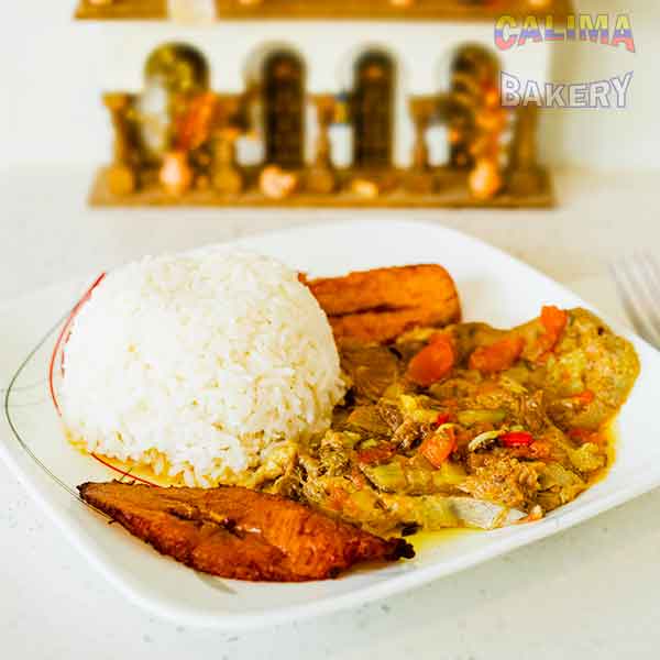 Carne encebollada. (Steak with sauté Onions, rice, and fried sweet plantains)